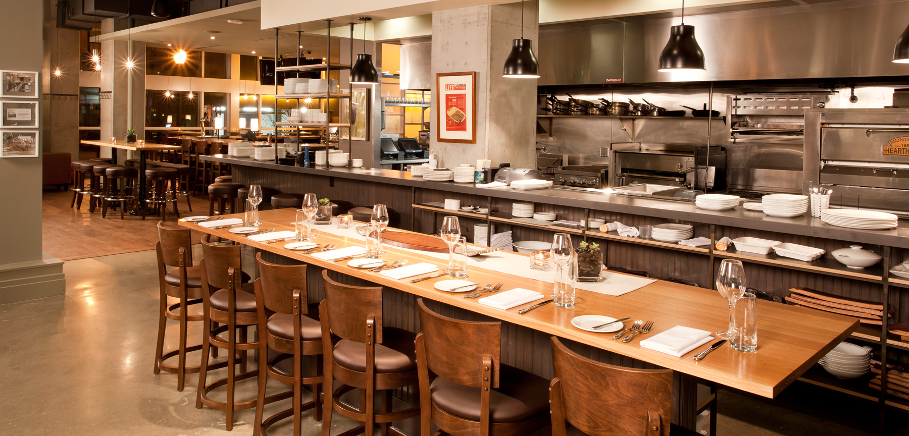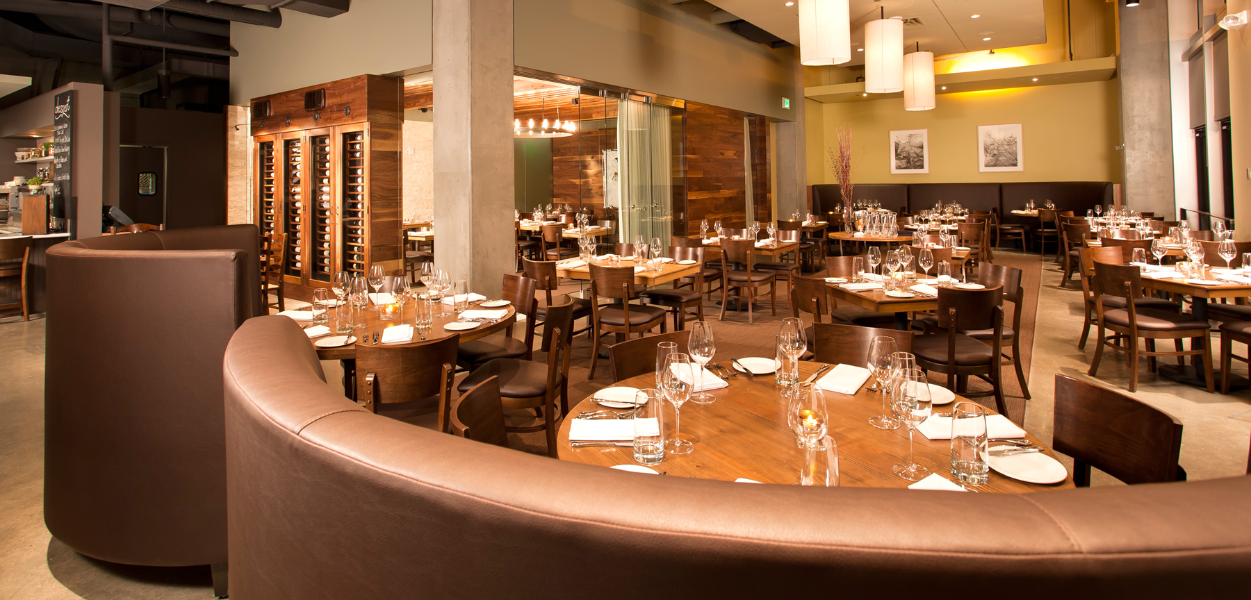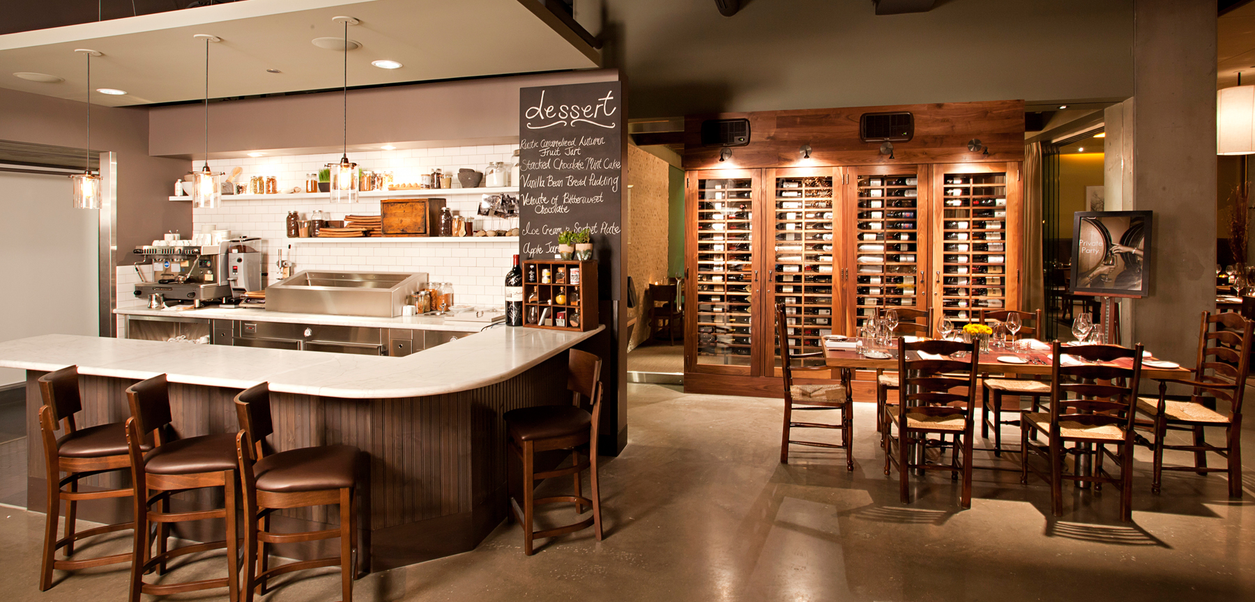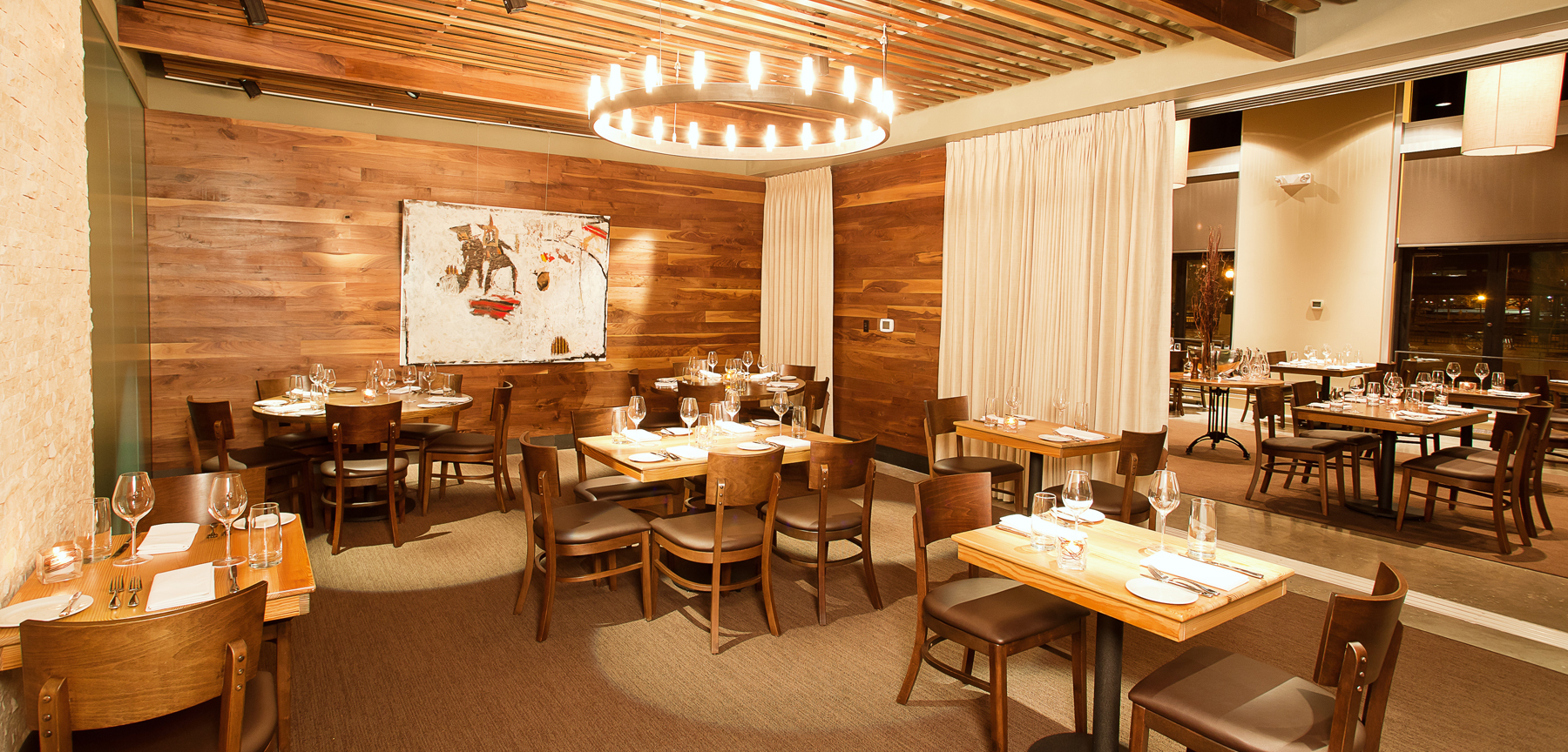 The restaurant features a dramatic open kitchen and flows elegantly from the two-story windows of the bar that overlook Wewatta Street to the equally spacious main dining room. The private dining room boasts rich walnut and stone finishes, sliding glass doors, and a walnut wine rack that covers one entire end of the room. The existing full-height windows that run the entire length of the bar and main dining room was modified to allow them to be opened to enjoy the cool Colorado summer breezes. A patio with a raised deck offers a perfect setting on warm or cool nights thanks to the concrete topped fire table. Custom light fixtures adorn each room of the restaurant, with the show piece being the grand chandelier that hangs prominently over the large community table just inside the entry, which was created from three separate wine vines that were excavated from a California vineyard and adorned with hundreds of pin lights. Millwork pieces of metal and various species of wood accent every nook and cranny of the restaurant to bring about the perfect blend of French culture and natural Colorado beauty.