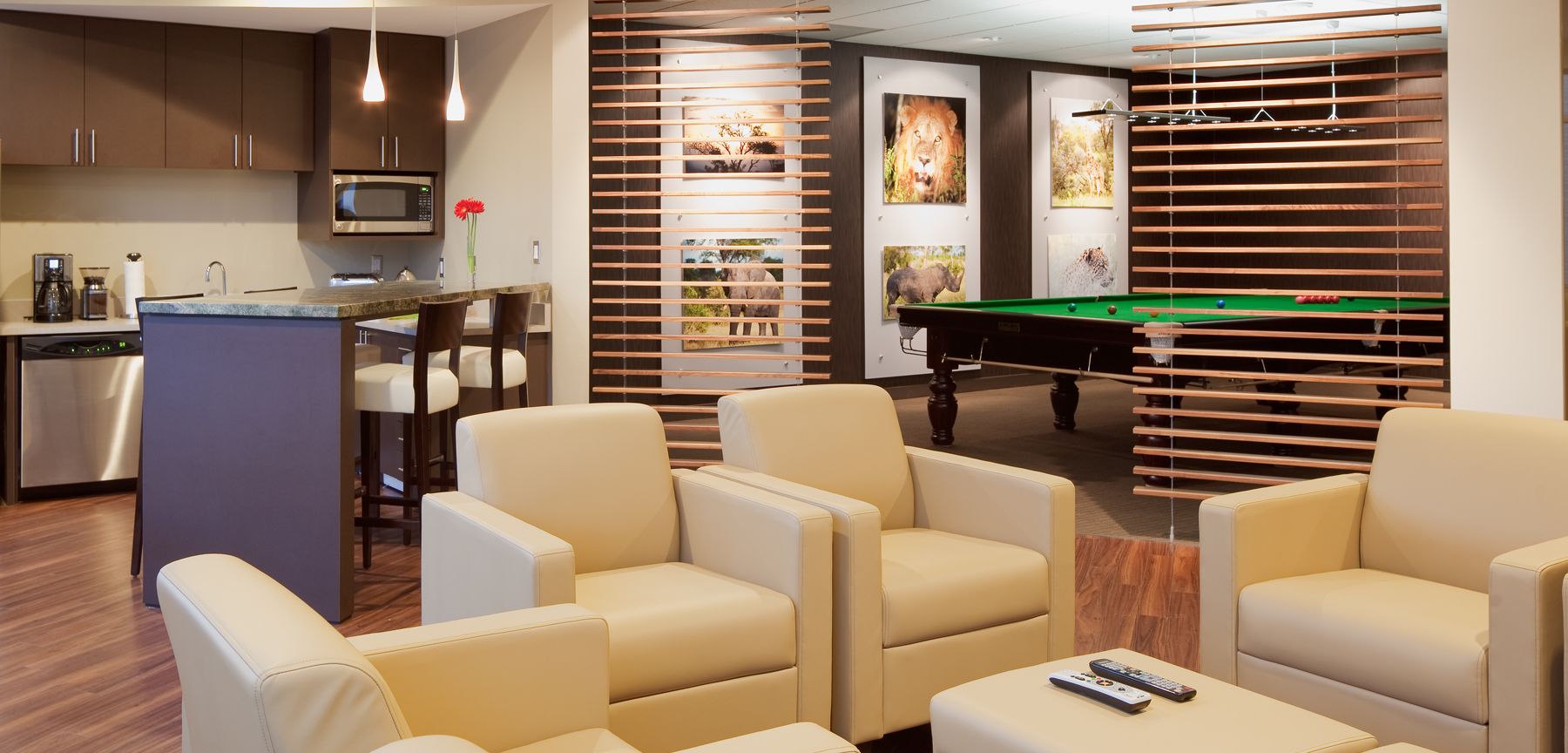 Acquilano and Jordy Construction were able to create a space that allowed the client’s hobbies and interests to be a focal point via the use of acrylic wall panels and accent lighting that prominently display photographs from the client’s adventures around the world. Creature comforts such as a plush lounge, break area, and billiard room that houses a custom snooker table allow McMahon & Company to keep both clients and employees happily entertained.