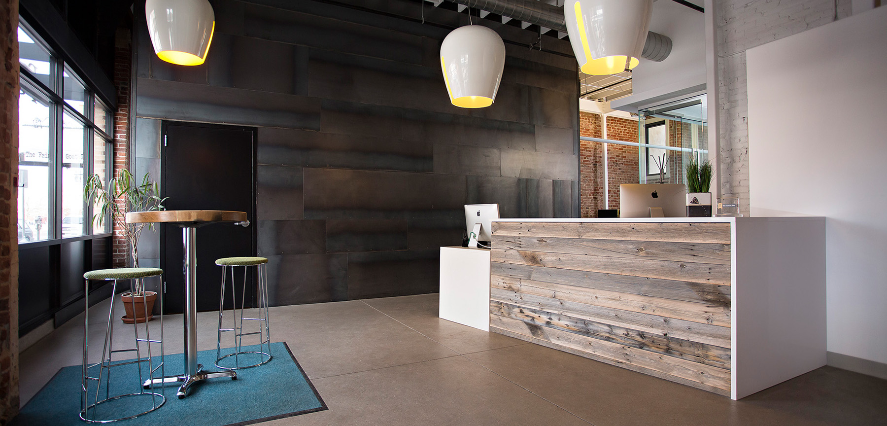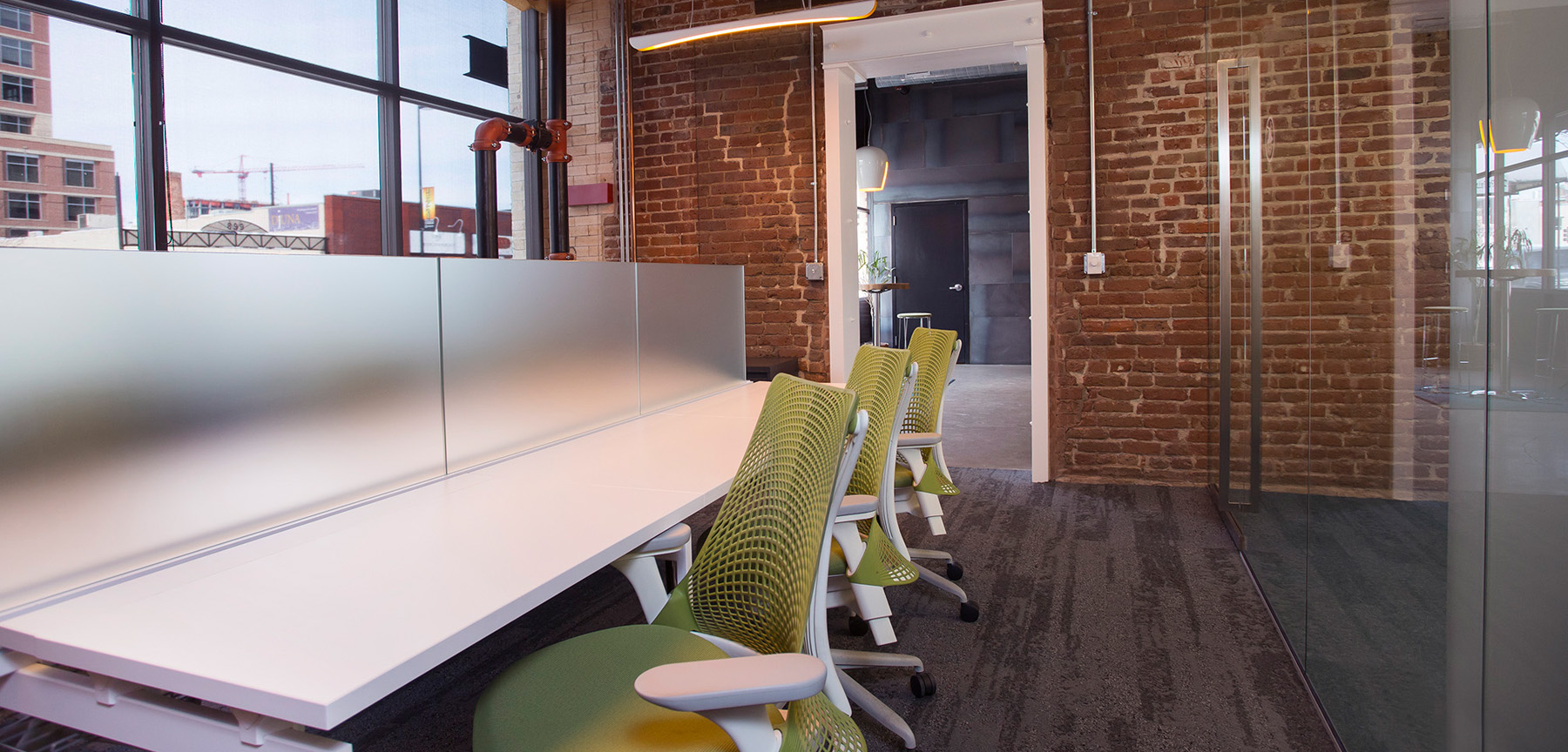 In order to open up the space, the offices were reconfigured and large glass doors and glass wall panels were put in place lending to maximum transparency. New drywall was installed, while leaving the original brick of the building to show through in many of the areas throughout the space. New acoustical ceiling panels were put in place along with modifications to the millwork on the 1st and 2nd floors, mechanical, fire protection systems, electrical and lighting throughout.
