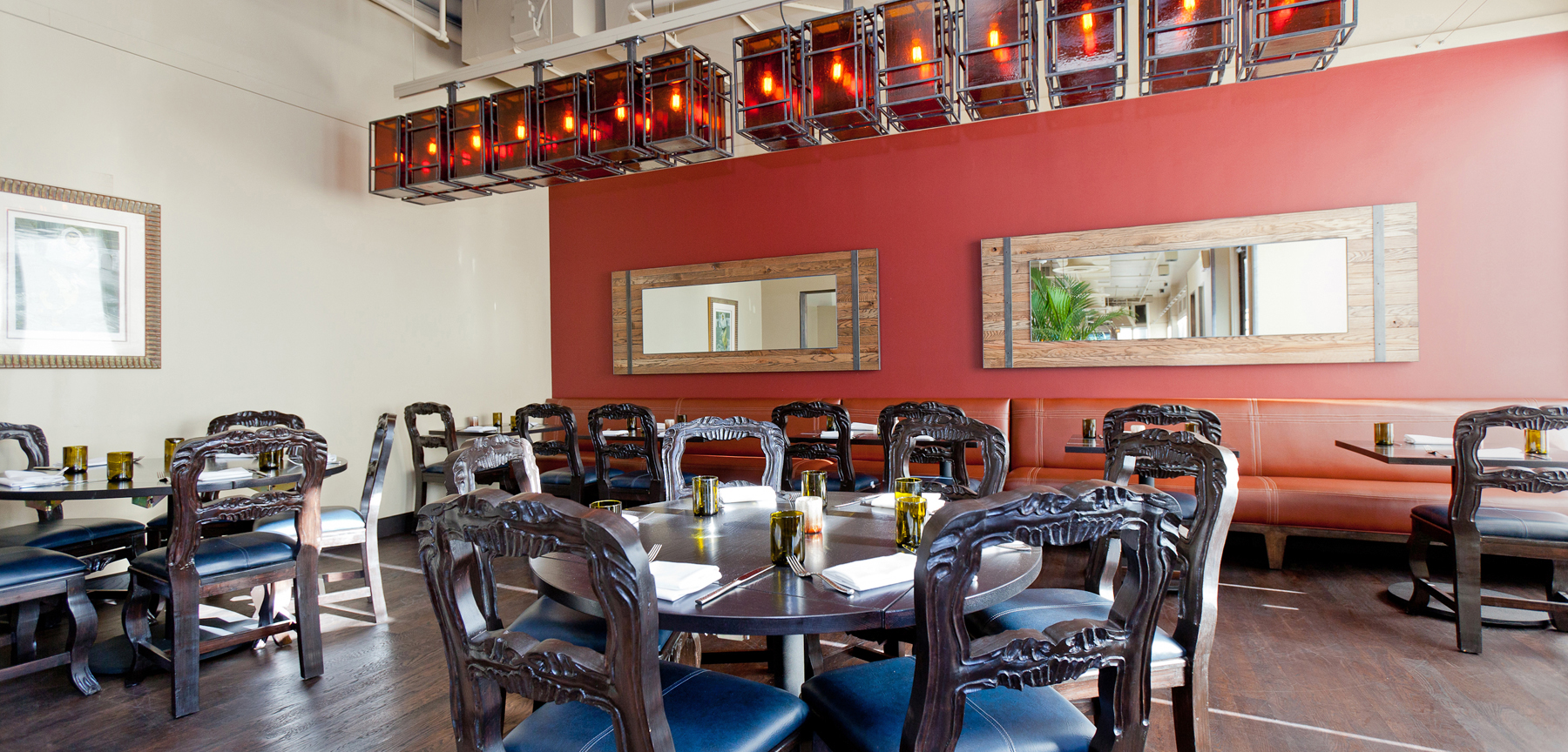 Major finish upgrades were completed at the first floor dining rooms, bar, and restrooms; the second floor stairwell and private dining room; and the second floor rooftop patio. These finishes consisted of dark, rich hardwood flooring and wood base throughout the dining rooms and refinishing of the existing painted wood stairs and landings to match the new hardwood, new tile walls in the restrooms, metal cladding on the existing partial height walls in the main dining room, and a fresh coat of paint throughout. Custom millwork pieces were installed to create dramatic effects throughout, as well, including cladding the existing host stand in reclaimed naturally finished wood planks; dark stained oak cladding at the first and second floor bar die walls; stained oak trim at the first floor bar top; stained oak shelves with accent lighting at the back wall of the first floor bar to accentuate Tamayo’s vast selection of tequila; custom cabinets at the first floor bar, second floor stair landing, and second floor private dining room; and custom steel tops and back bar tequila lockers with accent lighting at the patio bar. The project also included a complete lighting upgrade throughout the restaurant with many custom fabricated fixtures.