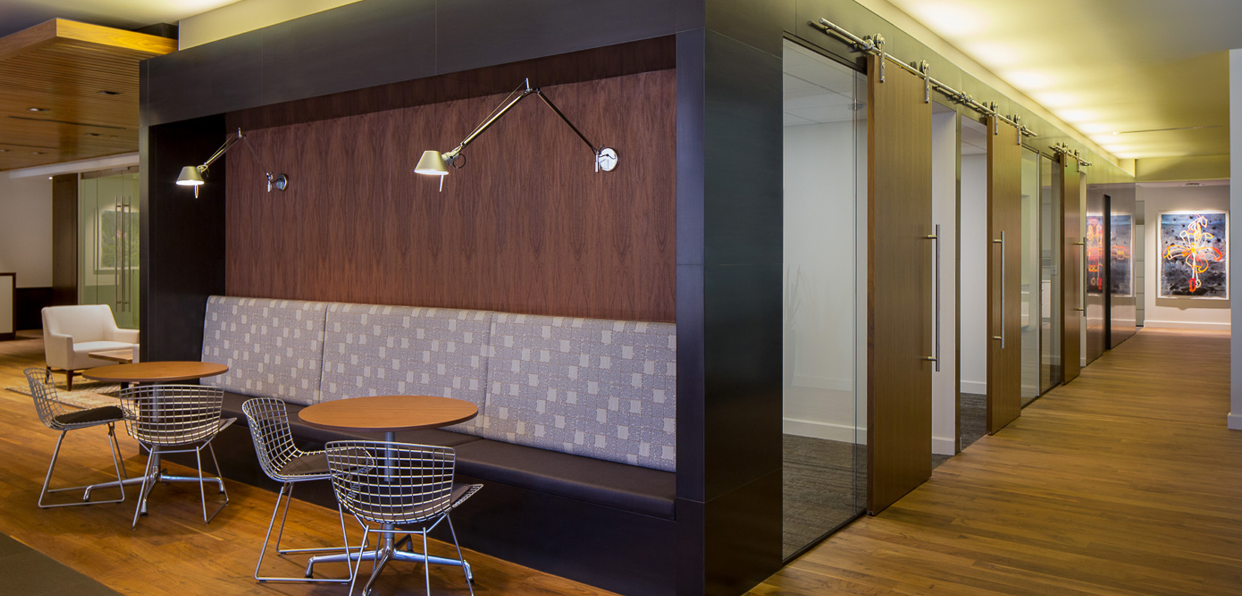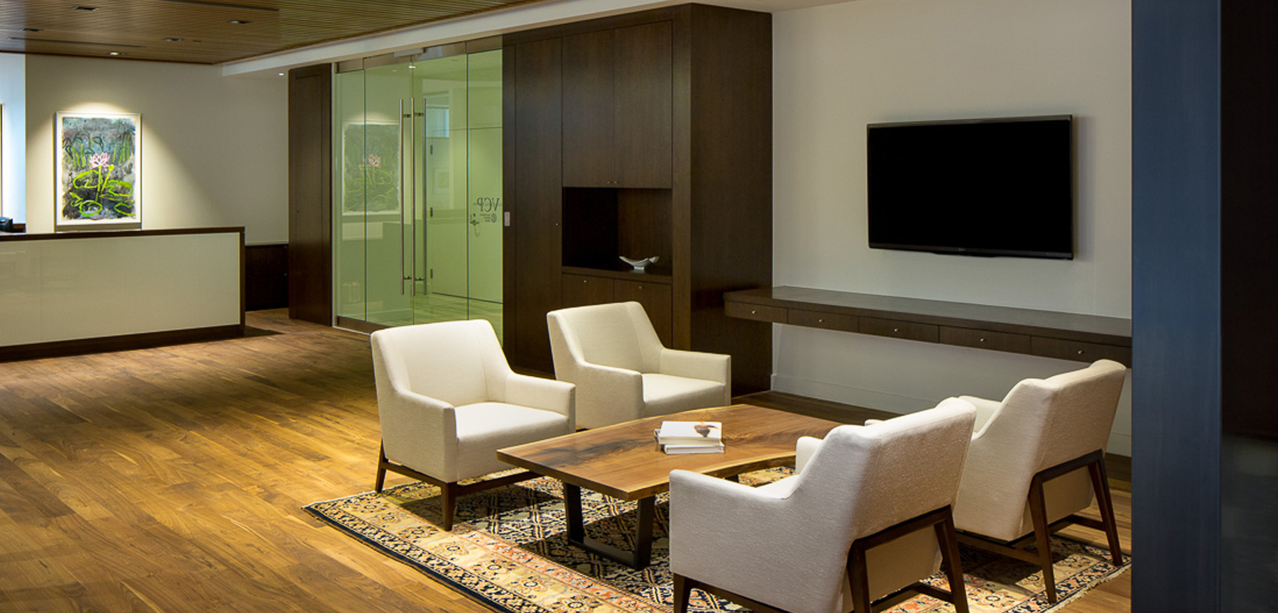 Jordy Construction was selected as the General Contractor for the build out of Vestar – a capital finance company. The architect of record was Semple Brown Design – Mary Kay Sunset. The project was a full build out from a warm core and shell. Naturally, full mechanical, electrical, and plumbing systems were installed. The overall design of this project is stunning. The space is complete with custom sliding doors, high end millwork – wood paneled walls, barn doors, and niche alcoves. The floors are walnut throughout the space. Vestar was a 12 week schedule and fell within the contract budgeted amounts. This project was a success for all involved. It was a pleasure working on another project with Semple Brown Design and meeting the owners of Vestar Capital Partners.