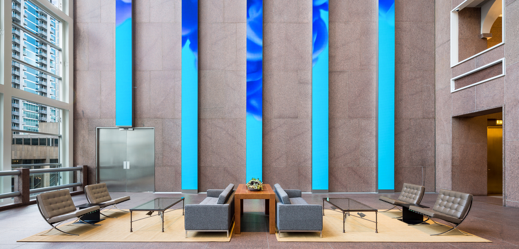 The Wells Fargo Center was last updated in 2002 and although the building was in great condition, the owners decided it was time to refresh the lobby. The intention was to stay true to the building’s original architecture and character while being creative in a contemporary way. Larger pieces of public art were added along with digital artwork by way of monolithic screens to help engage visitors and tenants.